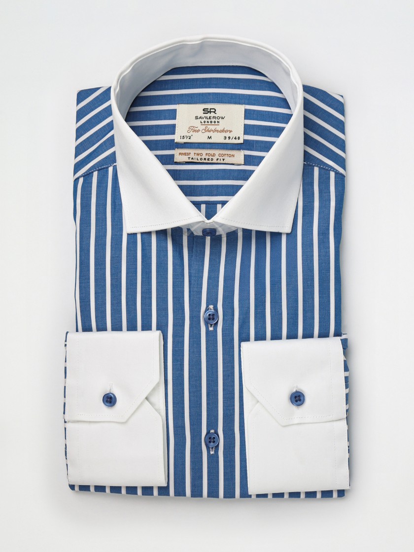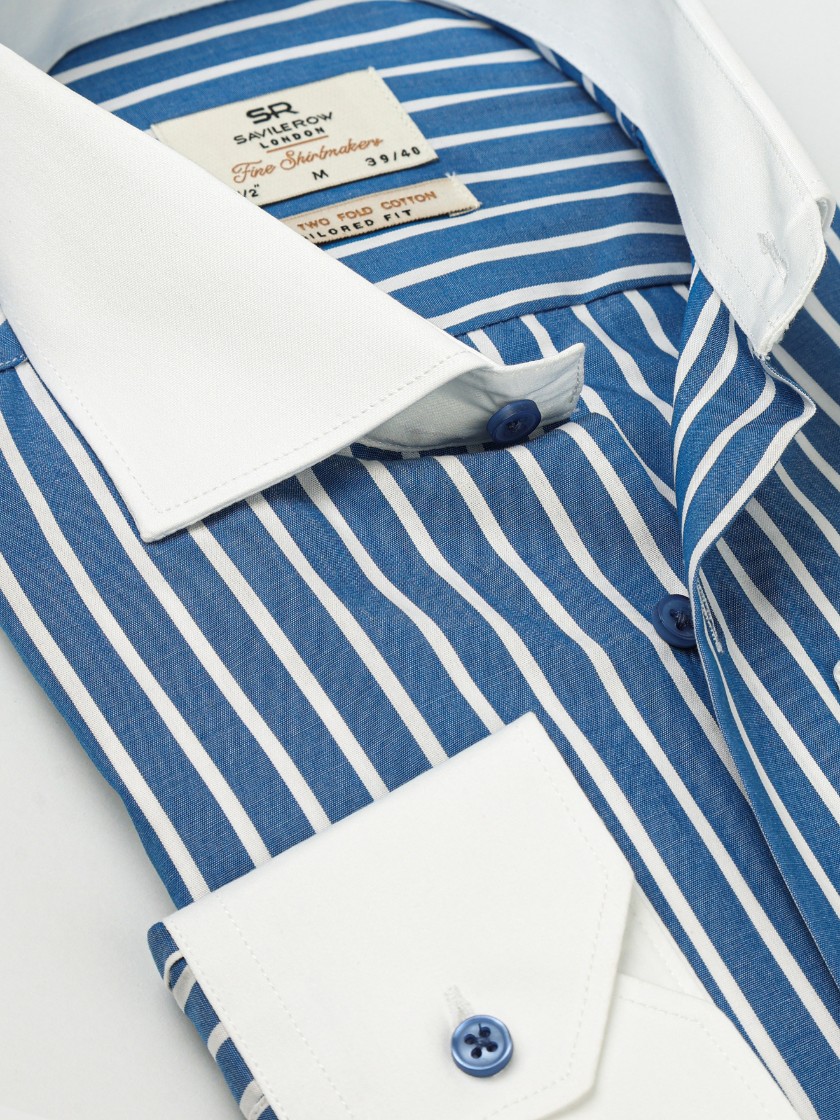 Adoptez un style affirmé avec cette chemise ajustée bleu royale ornée de rayures blanches. Le contraste du col et des poignets lui confère un caractère chic et intemporel, parfait pour sublimer un costume ou se porter seule avec un pantalon habillé. Conçue dans un coton double retors de qualité supérieure, elle combine élégance, confort et tenue irréprochable.