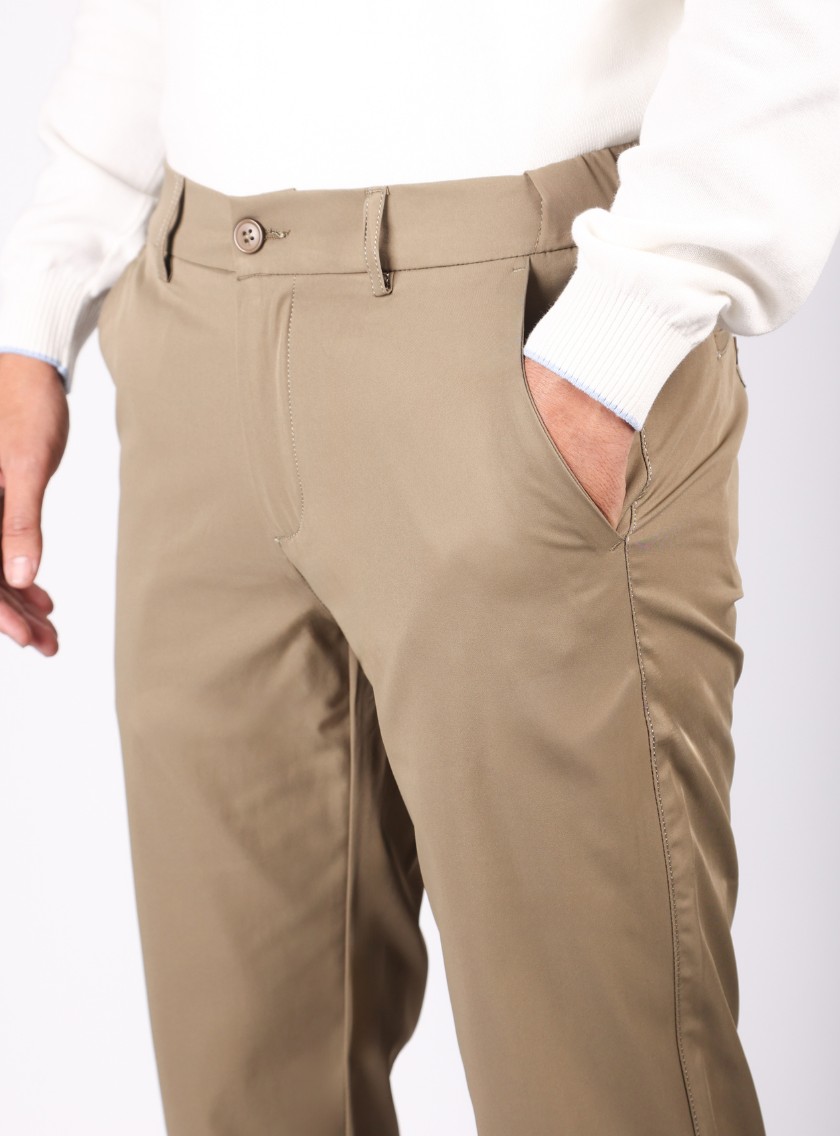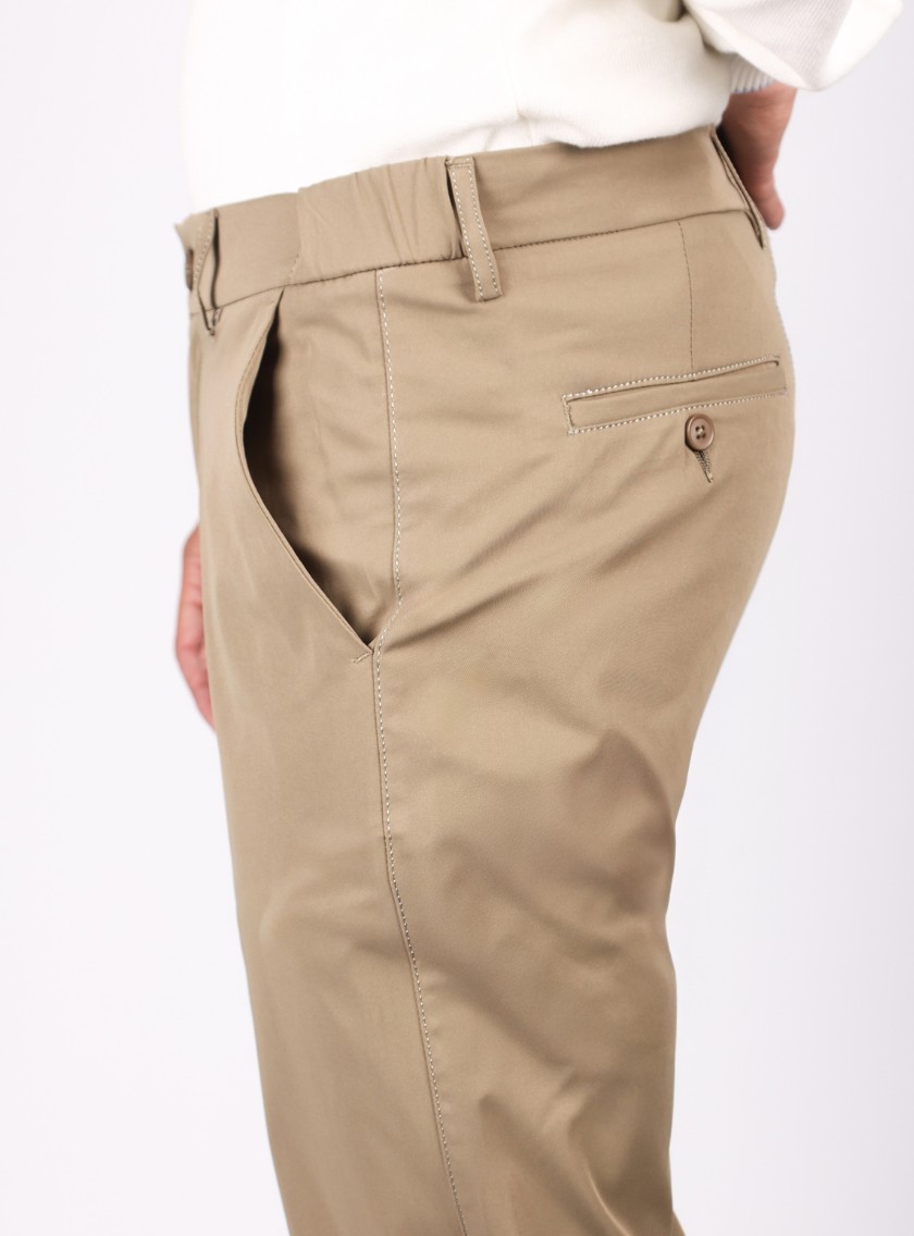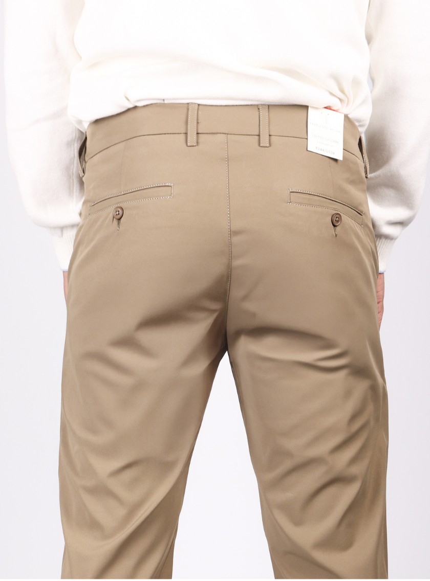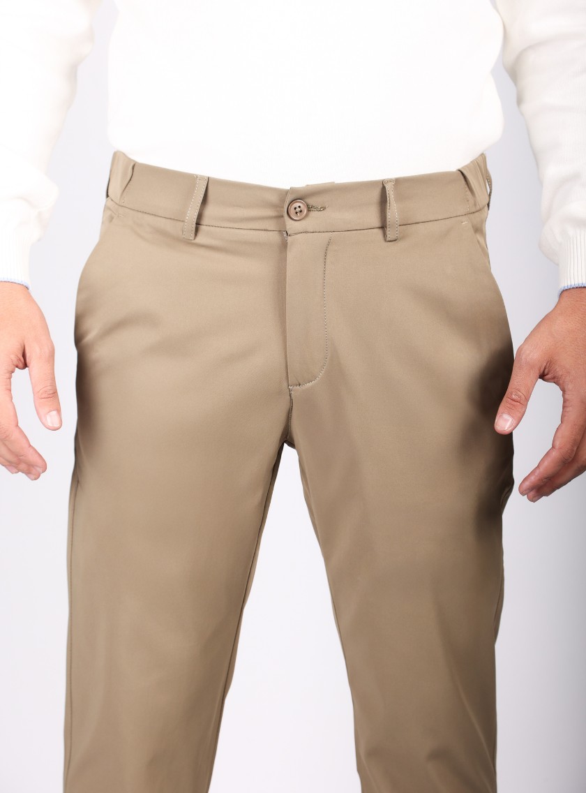 Apportez une touche de raffinement à votre tenue avec ce pantalon ajusté en toile coton en beige, parfait pour toutes les occasions. – Voir plus